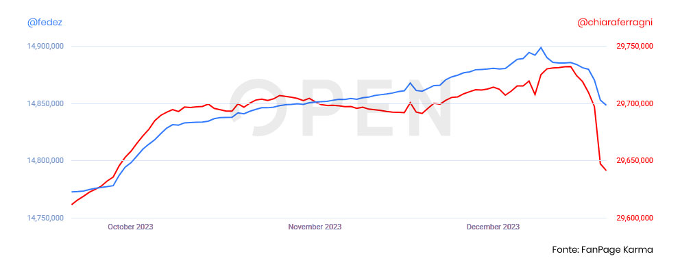 Facendo un paragone unico, è da notare che i Ferragnez, sia nel matrimonio che sui social, sembrano condividere un destino comune. Analizzando i dati di FanPage Karma negli ultimi tre mesi, nonostante una sostanziale differenza di follower che supera i 10 milioni tra loro, i loro grafici mostrano modelli paralleli di aumenti e perdite. Da segnalare il costante calo dei follower totali di Fedez a partire dal 9 dicembre, precedente allo scandalo Balocco.