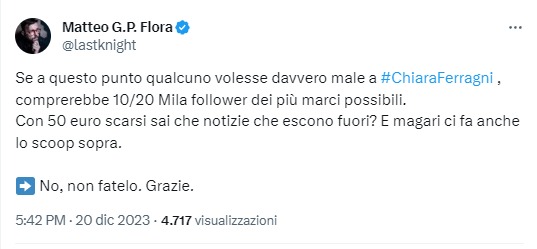 Nascono speculazioni su potenziali acquisti di follower da parte del team di Chiara Ferragni. Tuttavia, l’attribuzione di tali operazioni all’influencer o ai suoi collaboratori rimane non verificabile, poiché qualsiasi individuo potrebbe gonfiare maliziosamente il numero dei propri follower con account falsi. Matteo Flora, insegnante ed esperto di informatica, sottolinea questo rischio in un tweet del 20 dicembre, sottolineando la facilità con cui qualcuno potrebbe acquistare un numero significativo di follower a un costo minimo.