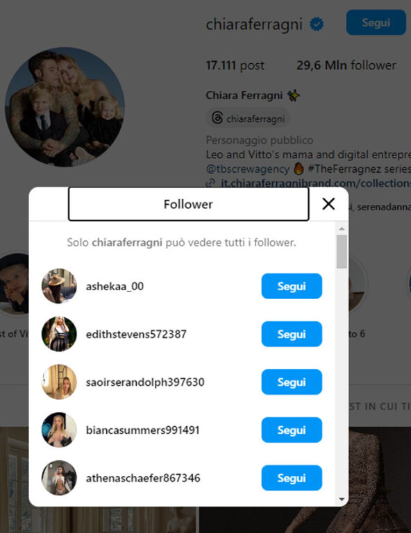 Determinare il numero reale di utenti che hanno deciso di allontanarsi da Chiara Ferragni dopo lo scandalo si rivela difficile a causa della mancanza di dati sulle recenti aggiunte. Alcune peculiarità emergono tra gli ultimi follower, con account creati nel dicembre 2023 e che pubblicano i loro contenuti iniziali nell’ultima mezz’ora, sollevando dubbi sulla loro autenticità. Gli esempi includono account come ashekaa_00, edithstevens572387, saoirserandolph397630 e biancasummers991491.