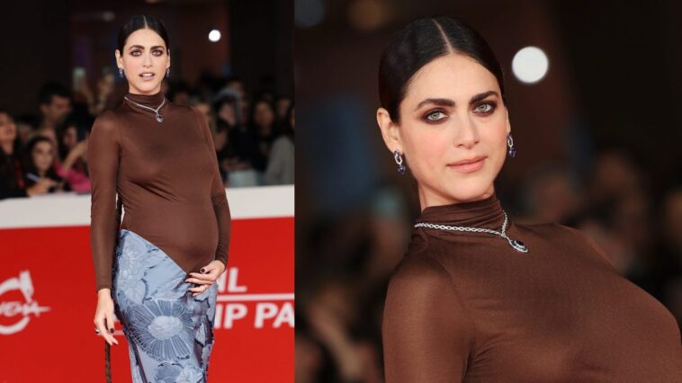 L’abito presenta un dettaglio intrigante: una lunga appendice di tessuto. L’intero ensemble ha splendidamente messo in risalto il suo pancione, rivelando che la 38enne è in dolce attesa. Ha parlato apertamente della sua gravidanza e della maternità in una recente intervista, mostrando quanto questi temi siano importanti per lei.